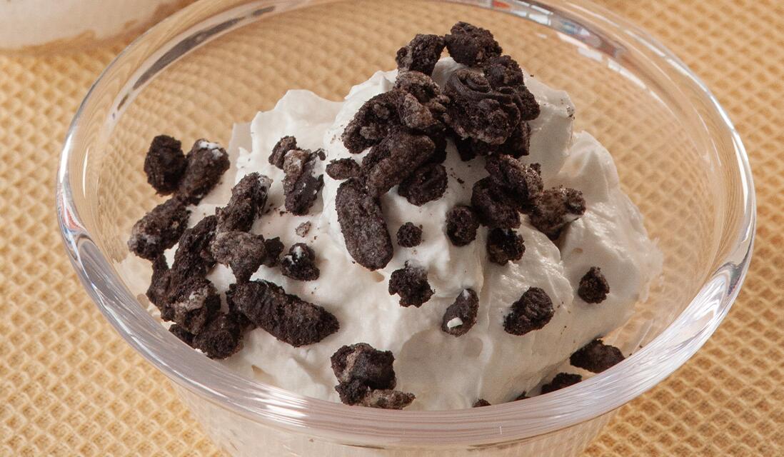 Охладеният сладкарски крем CREMIO се разбива с миксер за 2-3 мин. В края на разбиването се добавя захарта. Пасират се бананите с киселото мляко и се прибавят към разбития крем, като се разбърква бавно на ръка. Сервира се в купички и се поръсва с бисквитите.