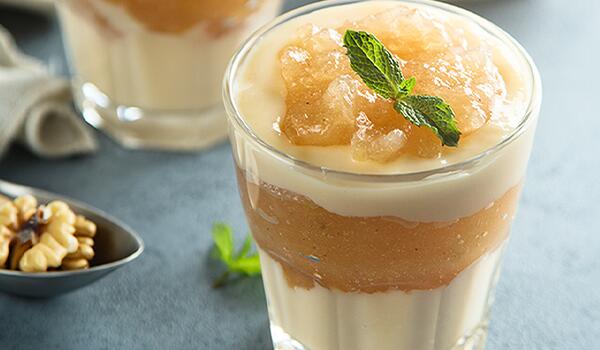 Ябълките се обелват и нарязват, а след това се слагат да се задушават във фурна с малко вода и захар до омекване. Пасират се омекналите ябълки, прибавя се разбитият сладкарски крем Cremio с останалата захар и леко запечените и счукани орехови ядки. Разбърква се плодовият крем и се изсипва в купички.