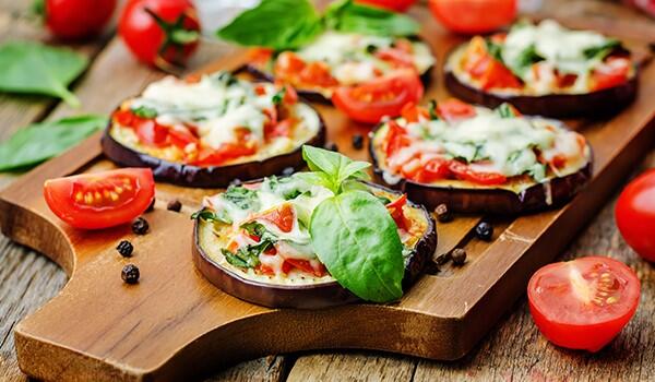 The eggplant is sliced into thin rounds, salted, and left to sit for 10 minutes. In the meantime, the tomato is diced into small cubes. The eggplant slices are drained and arranged on a baking sheet lined with parchment paper. They are brushed with olive oil or vegetable oil and baked for 20 minutes in a preheated oven at 180°C. Then, on each eggplant slice, place the diced tomato, chopped basil, and grated MyDay cheese. The seasoned eggplants are baked for an additional 5-7 minutes. Enjoy your meal!