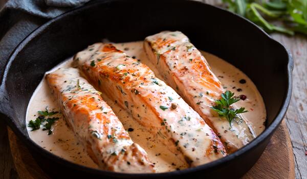 Филетата от сьомга се овкусяват със солта и черния пипер, след което се запичат за 3 мин. от всяка страна в малко мазнина. В отделен съд се запържват нарязаните на дребно праз и чесън, като се задушават за няколко минути. Добавя се бялото вино и 2 мин. по-късно се прибавя и кремът за готвене Cremio. Сосът се готви около 3 мин. и се овкусява със сол, черен пипер и магданоз. Прибавя се сьомгата и се готвят заедно още 3 мин. при постоянно поливане на филето със сос.
