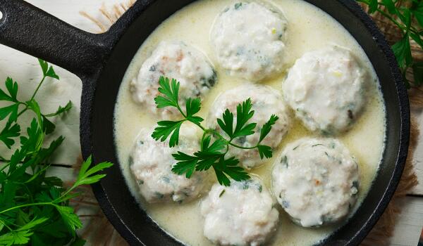 За застройката се препичат отделно 2-3 с.л. брашно. Разбива се киселото мляко със жълтъците и се добавя охладеното брашно. Към вече готовите кюфтета се добавя застройката при непрекъснато бъркане. Добавя се готварски крем Cremio, като се бърка още 2- 3 мин.