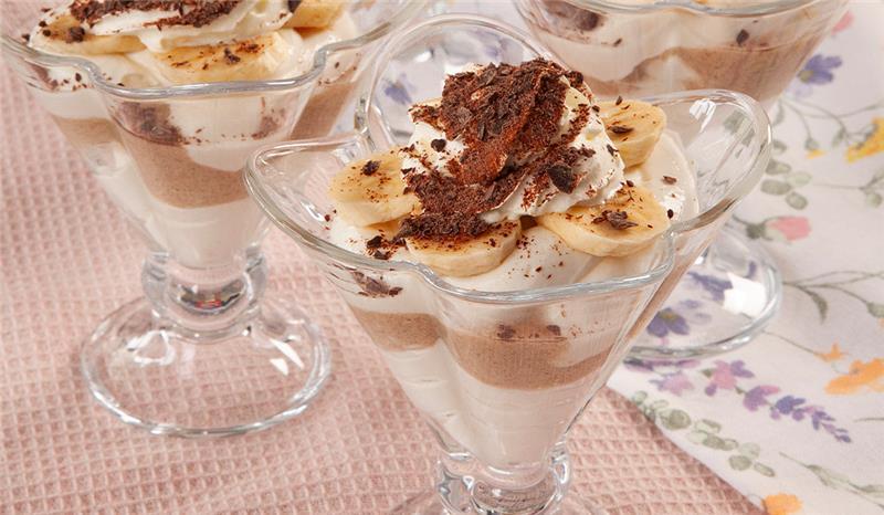 300 мл сладкарски крем Cremio 200 г цедено кисело мляко 3 бр. банани 100 г захар 50 г настърган шоколад