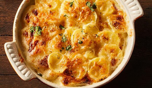 Картофите се измиват, обелват и нарязват на колелца. Изсипват се в тавичка и в нея се смесват с предварително подготвените подправки (розмарин, мащерка, риган, червен и черен пипер, сол). Овкусените картофи се заливат с Cremio за готвене. Ястието се пече около 45 мин. при температура 180 градуса.
