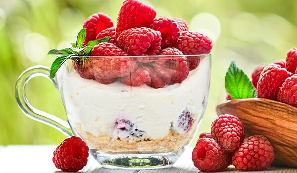Смесват се бисквитите, бадемите, орехите, меда, маслото и канелата и се разбъркват добре. Получената смес се изсипва в подходящи малки форми (купи или чаши), притиска се добре и се оставя в хладилник. Желатинът се накисва в студена вода, за да набъбне. Шоколадът се разтопява на водна баня и се смесва с желатина и ваниловия екстракт. Сладкарският крем Cremio се разбива добре с миксер (предварително охладен за поне 8 ч.), след което се прибавя шоколадовата смес, като се разбърква внимателно с шпатула. Малините се подреждат върху бисквитения блат и отгоре се разпределя кремът, след което десертът се прибира за няколко часа в хладилник. Преди сервиране декорирайте с малини и листенца мента.