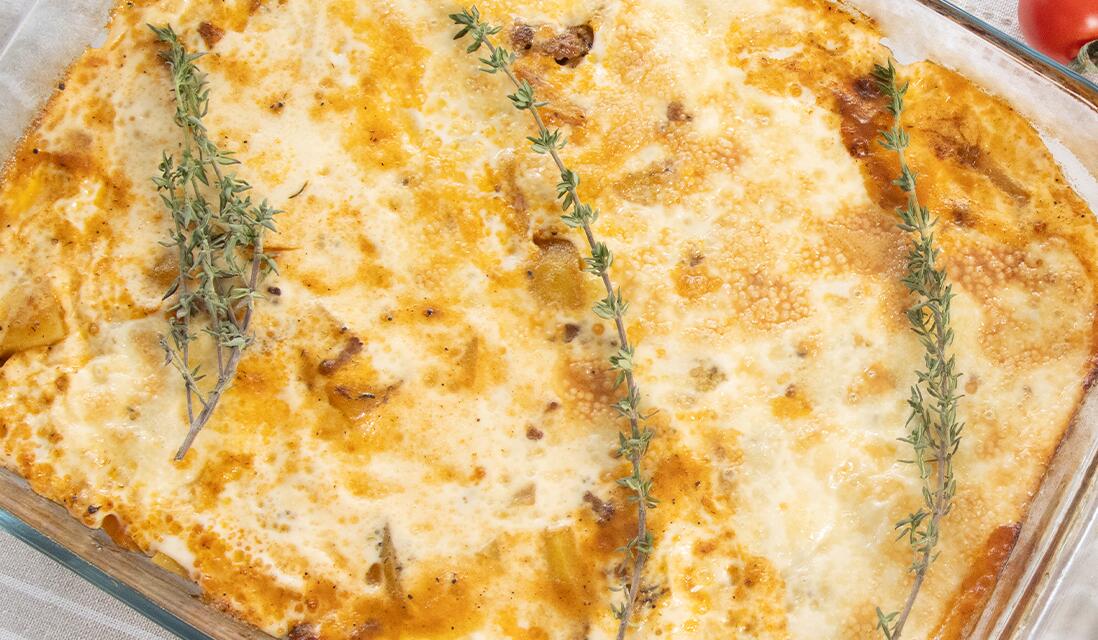 Лукът и морковът се нарязват на ситно, а картофите – на малки кубчета. Яйцата се разбиват и се смесват с готварския крем CREMIO и сол. В загрята мазнина се запържват лук и морков до златисто. Добавя се каймата и също се запържва. Накрая се запържва и доматеното пюре. Овкусява се с черен, червен пипер и сол. Разбърква се добре. Добавят се картофите за 1-2 мин., за да се смесят хубаво всички вкусове. Изсипва се в тавичка, добавя се чубрица и се покрива с алуминиево фолио, за да остане по-сочна мусаката. Пече се в предварително загрята фурна на 200°C за 40-50 мин. Изважда се, маха се фолиото, изсипва се заливката и се пече още 20 мин.