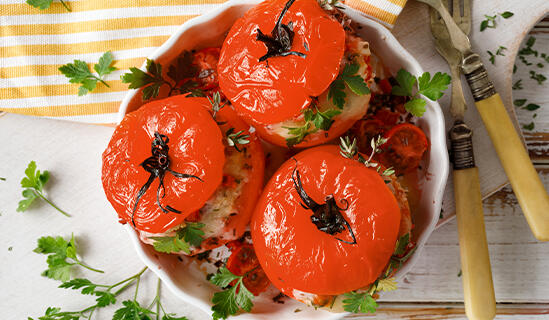 Отрязват се капачетата на доматите и с помощта на лъжица се премахва вътрешността им. Слага се сол и се обръщат, за да се изцедят от течността. За пълнежа се задушава ситно нарязаният лук в олиото. Щом омекне лукът, се добавя месото и настърганите пащърнак, морков и целина. Подправя се с розмарин и се запържва до омекване на зеленчуците. Доматите се пълнят с получената смес. Разбърква се яйцето с магданоза и готварския крем Cremio и се заливат доматите. Доматите се пекат в загрята фурна на 220 градуса.