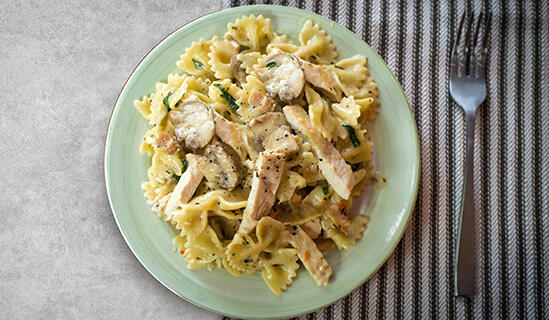 Гъбите и пилешкото филе се задушават до готовност в загрятото масло. Прибавят се виното и кремът за готвене Cremio, като се бърка до леко сгъстяване на соса. Овкусява се. Пастата се вари и се отцежда, добавя се сосът с гъбите и филето и всичко се разбърква внимателно.