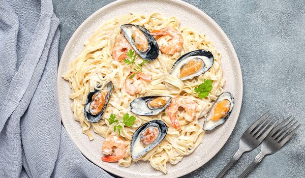 Пастата се сварява спрямо указанията на опаковката и се оставя на страна. Мидите и скаридите се сваряват за кратко, след което се отцеждат и почистват.