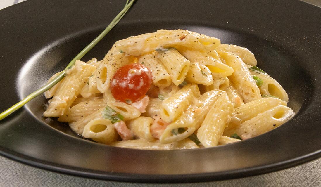 Finally, pour in 200 ml of CREMIO for cooking, season with salt and pepper, and let cook for 1 minute. Add the drained pasta, stir well, and serve garnished with chopped chives.