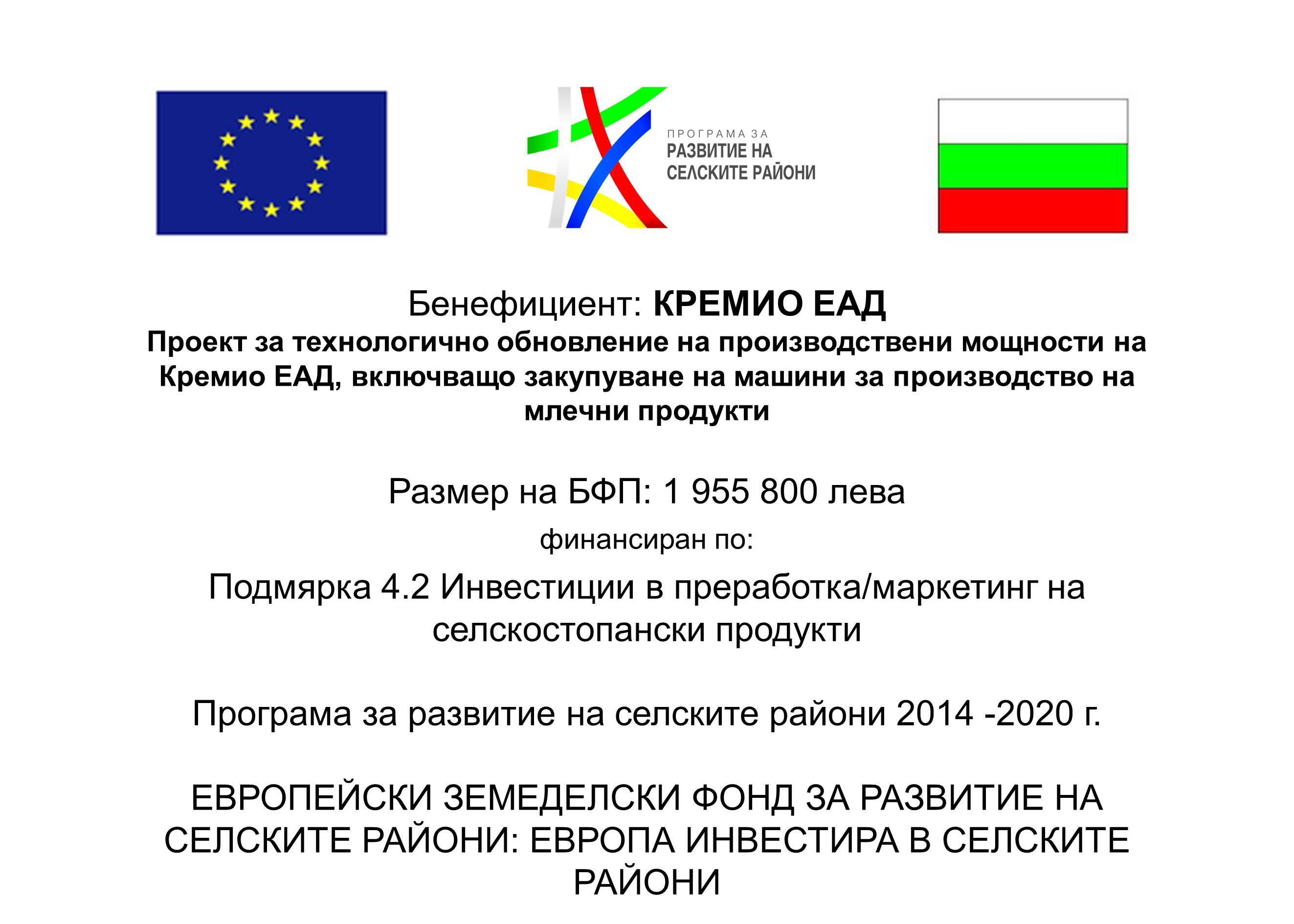 Проект за технологично обновление на производствени мощности на Кремио ЕАД, включващо закупуване на машини за производство на млечни продукти