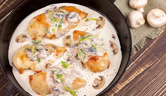 Посоляваме и поръсваме с черен пипер пържолите, овалваме ги в брашното и ги пържим от двете страни. Изваждаме ги и ги оставяме на топло. Лукът нарязваме на ситно и го запържваме в същата мазнина, добавяме нарязаните на филийки гъби и продължаваме да задушаваме. Разреждаме с бялото вино и лимоновия сок, добавяме готварския крем Cremio и варим соса, докато се сгъсти. Готовият сос подправяме с черен пипер, сол и индийско орехче. Поднасяме пържолите полети със соса и гарнитура по желание.