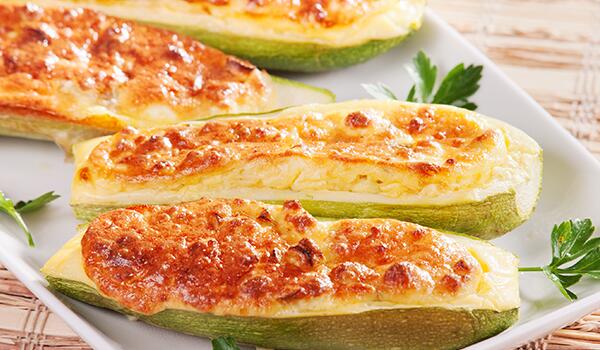 The zucchinis are washed and cut in half lengthwise. The insides are scooped out with a spoon, almost to the skin, and blanched in a suitable pot for 1 minute. The eggs are beaten in a larger bowl, and the grated My Day cheese and white cheese are added. The mixture is then combined with the chopped garlic, salt, black pepper, and Cremio for cooking. The zucchinis are filled with the prepared stuffing, arranged in a greased baking dish, and baked at 180°C in a preheated oven. The finished zucchinis are sprinkled with finely chopped dill.