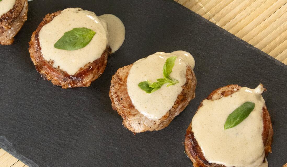 Бонфилетата се почистват от ципите и жилите и се нарязват на шайби с дебелина 2-3 см. Всяка шайба отстрани се завива с тънка лента бекон, листенце босилек и се завързва с канап, за да се запази формата по време на готвене. В загрят тиган се разтопява маслото с олиото. Месните шайби се подреждат в горещата мазнина и се пекат по 4-5 мин. от всяка страна като се обръщат по няколко пъти, за да се изпекат равномерно. Овкусяват се със сол и черен пипер. Месото се изважда от тигана и в същата мазнина се налива готварски крем CREMIO. Добавя се намачканото синьо сирене и се разбърква за 1-2 мин. При сервиране шайбите се подреждат по 3 броя в чиния и отгоре се заливат с получения сос.