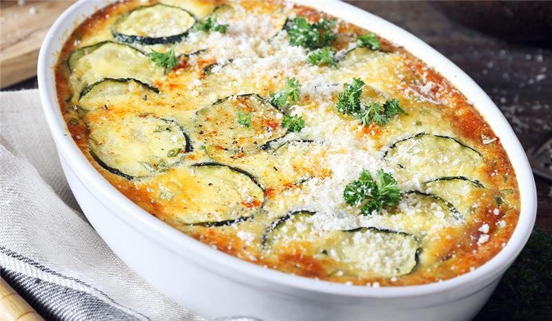 Картофите нарязват на много тънки колелца. Подреждат се в намаслена тавичка и се поръсват със сол и черен пипер. Върху тях се подреждат нарязаните на тънки филийки тиквички. Поръсват се със сол и черен пипер. Ястието се поставя във фурната и се пече 25-30 мин. при температура 200 градуса. Не се добавя вода, тъй като тивкичките ще пуснат достатъчно течност, за да се сварят картофите. Готварският крем Cremio, горчицата и ситно нарязаният копър се смесват като с получения сос се залива ястието и се пече до получаването на златист загар. Сервира се гореща и поръсена с настърган пармезан, украсете с магданоз(по избор).
